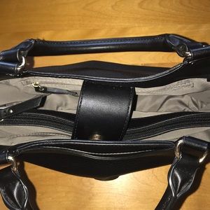 All zippers work. Outside of bag is very clean! No scuffs or blemishes. Handles great with no signs of wear! Gold accents. Magnetic closure. Zipper middle. Tri inner sections. Smaller pocket with zipper still has protective plastic.