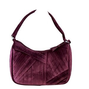 Luxurious vintage Vera Bradley quilted velvet hobo bag in a rich plum/burgundy shade. Features signature quilted detailing, soft velvet exterior, and classic floral cotton lining with interior zip pocket. Comfortable shoulder strap with silver-tone hardware and top zip closure.