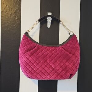 Elegant Juicy Couture hobo bag in quilted magenta. Features gold chain handle and iconic logo. Perfect for stylish outings.