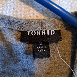 Torrid women's size 0 gray romper. Has a small hole and spot on the side near the pocket, otherwise in EUC, elastic waist, tear drop opening with button on the back, tiny top pocket, 2 side seam pockets
