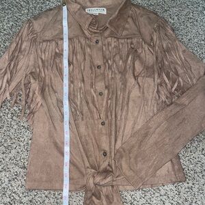 Chic tan button-up shirt featuring fringe accents. Perfect for a stylish look.