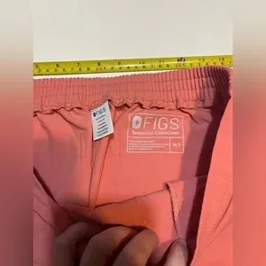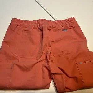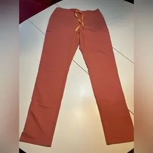 Stylish orange pants by Figs. Features drawstring waist and side pockets. Perfect for comfort and style.