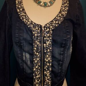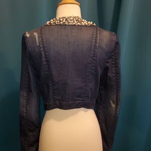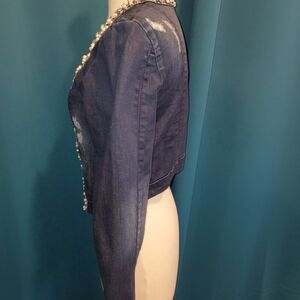 Bebe Embellished Cropped Denim Jacket | Pearl & Jewel Details | Fitted | M