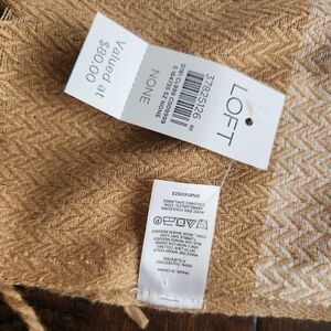 Cozy throw blanket by LOFT. Features a tan and cream pattern. Perfect for adding warmth and style.