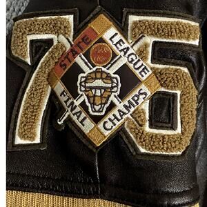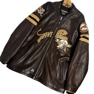Own a piece of history with this vintage Avirex leather bomber jacket! This men's size 4XL jacket features a classic brown color and iconic Star Series 75 New York Lions design.