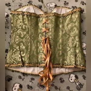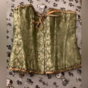 Stylish green brocade corset with intricate patterns. Features front button closure and ribbon detailing. Never worn.