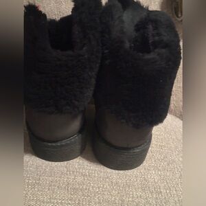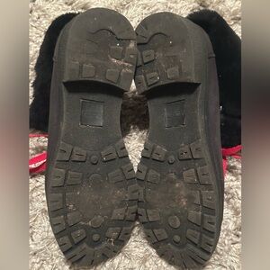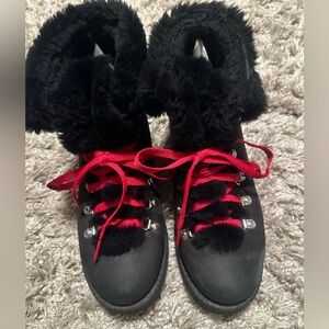 Please Zoom in & see all photos! First photo is stock photo! These some minor scratches and stains in good preowned condition Stylish black boots with cozy fur lining and vibrant red laces. Perfect for a chic winter look.
