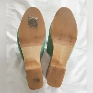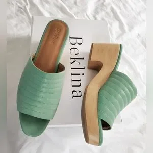 Beklina Mint Ribbed Open-toe Clogs Sandals 10. Style no longer sold on Beklina's site, hard to find colour in a hard to find size. This style runs true to size. Mint, jade, tropical green. Leather and wood. Faint smudge shown in photo.
