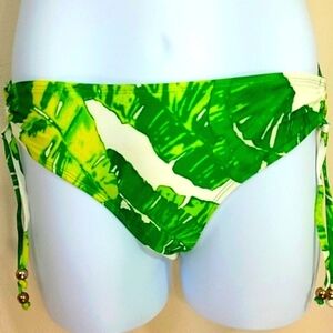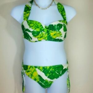 Bikini bottoms high waisted white with tropical palm leaf print green on white.