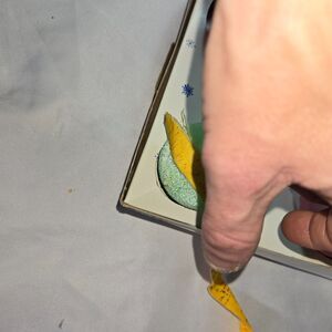 This is a box of unused Jewelbrite Glass Diorama Durable Christmas Ornaments. They are in three colors - Pink, Yellow, and Green. They each feature a singing choir angel set in a teardrop shaped ornament of frosted glass. These were made by Decor Novelties in the 1960s.