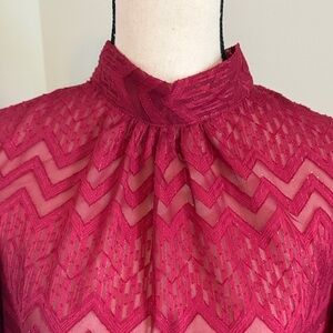 Chic fuchsia lace blouse with high neckline. Features long sleeves and elegant pattern. Perfect for stylish occasions.