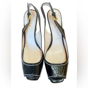 Prada Patent leather Black open toe and raffia platform with ankle strap.