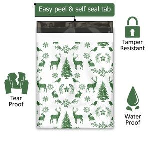 These 12x15 poly mailers feature an elegant green woodland Christmas print with deer, evergreens, snowflakes, birds, and holly — perfect for boutique sellers, small business owners, and holiday gift shipping. Strong, waterproof, and self-sealing to protect your products in transit.
