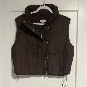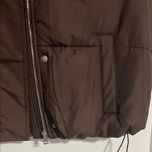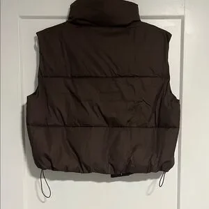 Chic chocolate brown puffer vest with zip and snap button closure. Ideal for layering. NWT