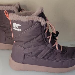 The SOREL YOUTH/ GIRLS WHITNEY II SNOW BOOTS in size 4 are designed for young girls who enjoy outdoor activities in the winter and fall seasons. These waterproof snow boots feature a round toe shape, lace-up closure, and a low heel height for comfort and stability. With a lined and insulated design, these boots are perfect for travel, activewear, and casual occasions. Made with a combination of nylon and synthetic materials, these brown and orange boots are not only stylish but also durable for walking, skiing, and hiking. The Sorel Whitney II boots are a reliable choice for keeping young girls warm and dry during cold weather adventures.