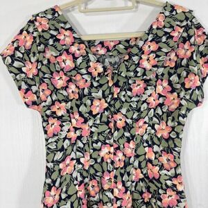 Keywords: Maggy London, floral dress, midi dress, vintage dress, garden party dress, summer dress, size 8 dress, linen blend dress, botanical dress, pink floral dress, green floral dress, retro dress, short sleeve dress