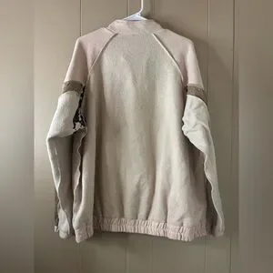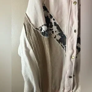 Chic bomber jacket with a unique pattern. Features beige and cream tones. Stylish and versatile for any outfit.