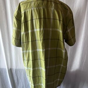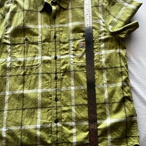 Stylish green plaid shirt by Carhartt. Short sleeves with button-down front. Perfect for casual outings.