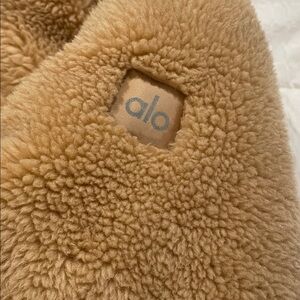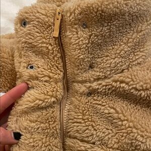 Insulated, very warm. Soft and cozy sherpa puffer. Features zippered side pockets and ribbed cuffs.
