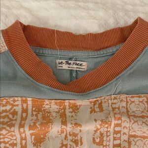 Stylish blue long sleeve shirt with orange patterned accents. Perfect for casual boho wear. Fabric frays as pictured.