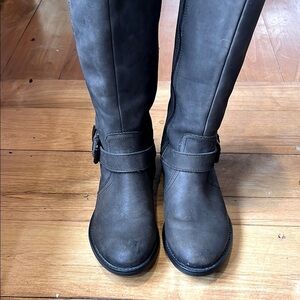 Stylish brown leather riding boots. Features a side zipper and buckle detail. Perfect for any occasion.