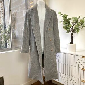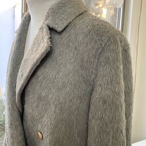 ~ Details: wool-blend textured “shag” finish, longline silhouette, fully lined, gold buttons, mid-weight warm