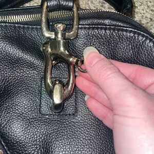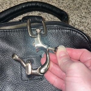 This AmeriLeather backpack in black offers a stylish and practical solution for everyday carry. Crafted from genuine leather, the backpack features a main zippered compartment, an external zippered pocket for easy access items, and a unique metallic clasp detail on the top. The interior reveals a brown fabric lining with "AmeriLeather" branding, along with multiple pockets including a zippered section and slip pockets to keep your belongings organized. This versatile bag is in excellent condition, showing minimal signs of wear and tear, making it a great addition for those seeking both fashion and functionality.