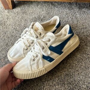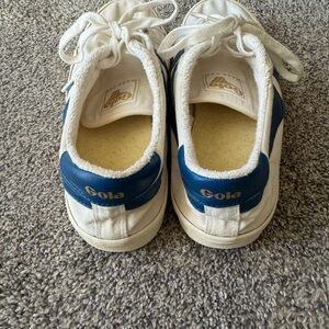 Gola sneakers with a white base and blue stripes. Comfortable and stylish for everyday wear. With some imperfections but can still be used. Inside shoe liner fell off from throwing them into the washer.