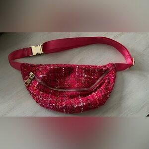 Add a pop of color to your outfit with this trendy pink tweed crossbody bag. So pretty!