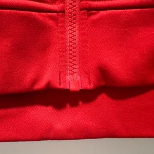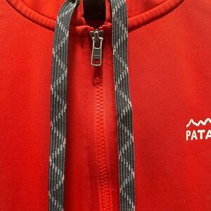 Red Patagonia hoodie with gray drawstrings. Features a sturdy zipper.
