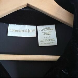 The Christie & Jill Black Velvet Blouse in XL is a glamorous and vintage-inspired top perfect for the holiday season. Made from luxurious velvet fabric, this blouse exudes a goth-inspired glam rock vibe, ideal for Halloween or themed events. The button closure and XL size make it a comfortable and stylish choice for women looking to add a touch of edgy sophistication to their wardrobe.