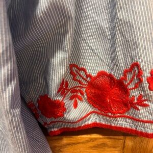 This relaxed blouse by Crown & Ivy features a light blue base with striking red embroidery, offering a boho-inspired look. The 3/4 sleeves and tie front add a touch of elegance, while the airy fabric ensures comfort. Perfect for a casual day out or a relaxed evening gathering.