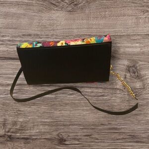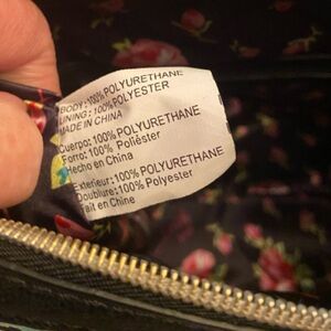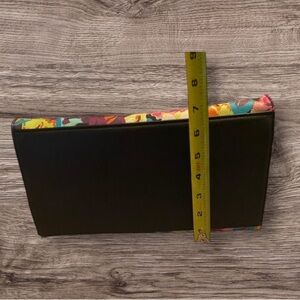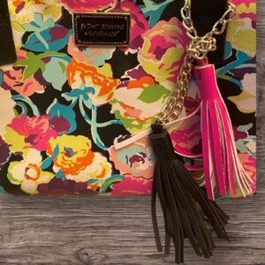 This Betsey Johnson satchel showcases a striking floral pattern in black and pink, complemented by a playful tassel charm. Its structured shape and versatile carrying options make it a stylish choice for any occasion. GREAT condition. Super cute.