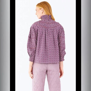The top has a smocked high neck, ladder trim, and a gathered yoke. All these details make this blouse one that effortlessly moves from day to night. 3/4 length balloon style sleeves. 100% cotton and 100% cotton lining.