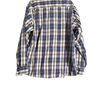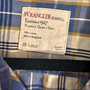 This Wrangler shirt features a classic blue and white plaid pattern, crafted from lightweight cotton for a relaxed fit. Ideal for casual outings, its timeless design ensures versatility and comfort.