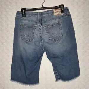 Trendy distressed jean shorts. Classic blue hue. Perfect for casual wear.