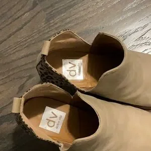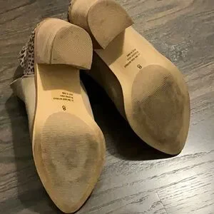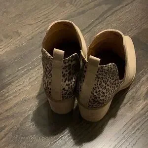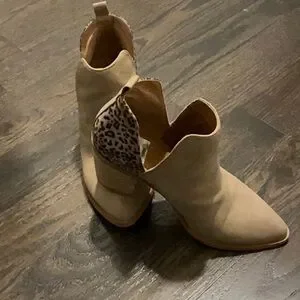 Stylish tan booties with leopard print detail. Perfect for a bold look. Wooden heel worn maybe two or three times. Pointed toe.