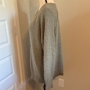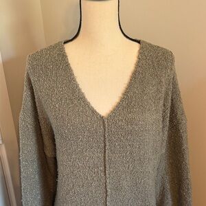 Stay warm and stylish with this cozy V-neck sweater. Perfect for any casual outing, this olive green oversized sweater if perfect for everyday relaxing. M/L