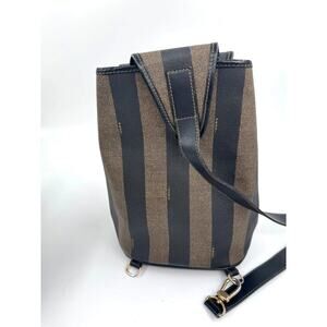 Wear in the front or on the back. Features coated canvas on the exterior, brown interior fabric, and gold-tone hardware. Unisex bag.