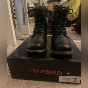 Rugged and stylish Freebird boots. Black leather with sturdy laces. Ideal for versatile wear.