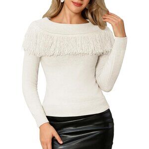 Features: This sleek, lightweight sweater features a stylish fringe detail, a classic boat neck or off-shoulder look, and a fitted silhouette that works for casual outings or dressier occasions. Crafted from soft, high-stretch fabric blend for comfort, warmth, and style.