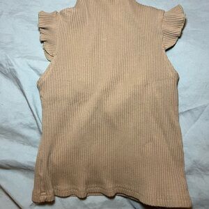 Stylish tan blouse with ribbed texture. Features ruffled sleeves for a feminine touch.