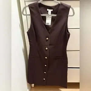 New with tags, never worn. Women’s size small. This elegant brown sleeveless dress features a sleek design with gold button accents. Perfect for any occasion, it offers a sophisticated look with its rich brown color.