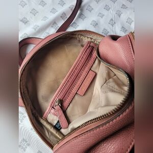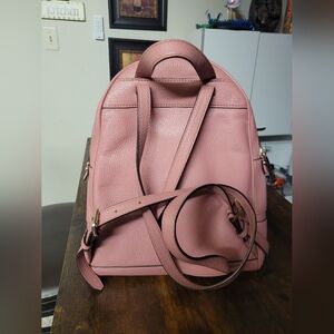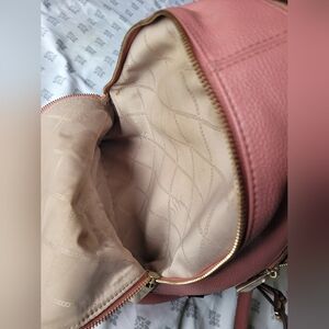 Chic pink backpack by MICHAEL Michael Kors. Gold-tone zippers and logo detail. Stylish and functional. Dimensions: 10.5”W X 12.75”H X 5”D. Stains on interior. Tarnishing zipper. Please see pictures carefully before purchasing. No exchange. No return.