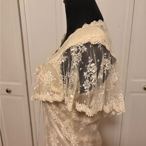 Beautiful vintage late 1970s–early 1980s romantic lace formal dress featuring an ivory lace overlay over a satin underlay. Elegant capelet-style lace sleeves, floral rosette appliqué at bodice, and a soft mermaid silhouette create a timeless Edwardian/Victorian revival look.
