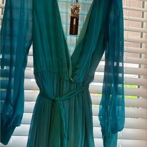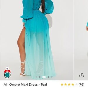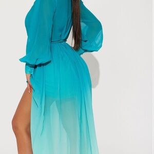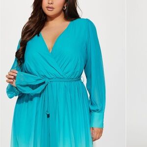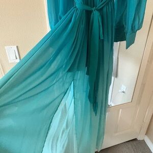 Step out in style with this elegant teal ombre maxi dress. Perfect for any occasion, this dress features a flattering wrap design and long sleeves. The vibrant teal color adds a touch of sophistication to your wardrobe.