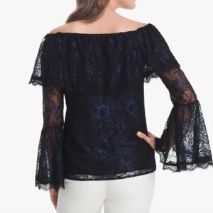 White House Black Market Navy Blue Black Lace Bell Sleeve Off The Shoulder Top