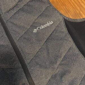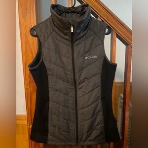 Columbia vest with a sleek design. Charcoal front with black sides. Ideal for outdoor activities.