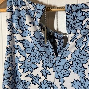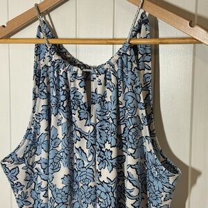 Chic sleeveless blouse with blue floral design. Ideal for versatile styling. Silver leather braided rope halter top style blouse. Size XL