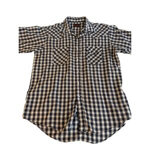Embrace rugged Western style with this classic plaid snap-button shirt. The crisp collar and pearl snaps add a touch of authentic cowboy flair, while the breathable short sleeves keep you cool and comfortable. Dual chest pockets offer practical storage for your essentials. Perfect for a day at the ranch, a casual night out, or a country music concert. Excellent Pre owned.